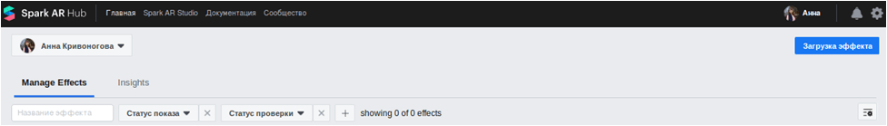 Вопрос о том, как добавить в Инстаграм маски, всё ещё открыт. Для того, чтобы фильтр появился в социальной сети, нужно использовать сервис Spark AR Hub. Открываем этот сайт и переходим на вкладку «Manage Effects», после – по кнопке «Загрузка эффекта». Да, перед этим авторизуемся с помощью Facebook.
