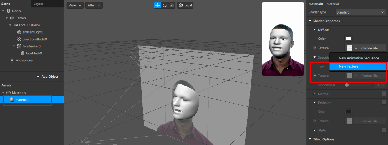 А текстура – то, что пользователи будут в итоге накладывать на своё лицо. Для этого снова жмём по «material» в левом меню, а после, в правом меню, в разделе «Texture», выбираем «Choose file». В выпадающем списке выбираем «New Texture».