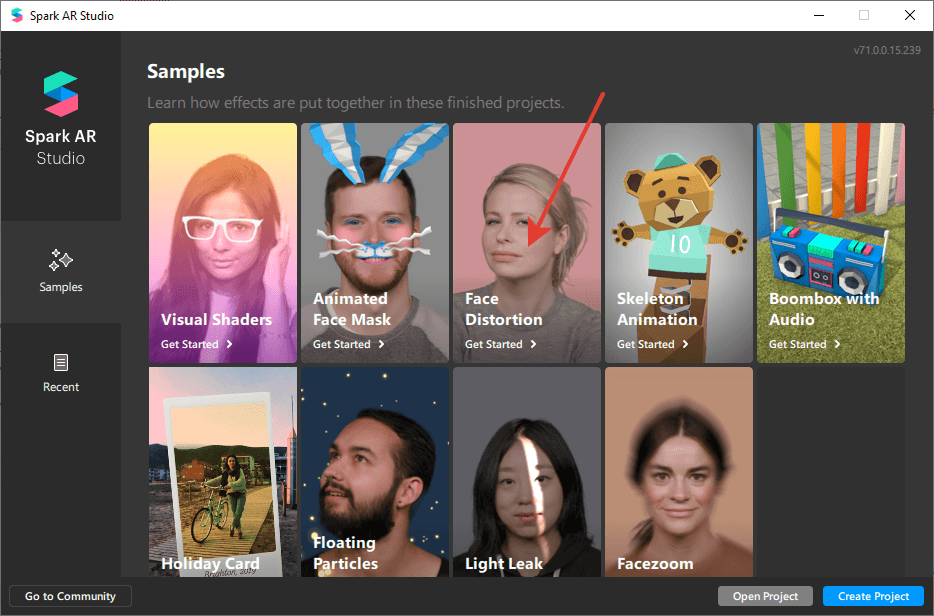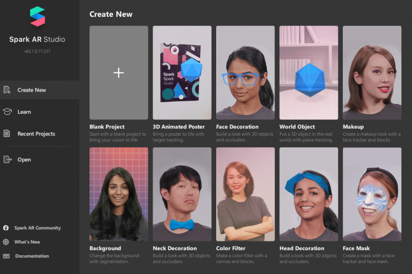 После запуска и ввода логина пароля, мы попадаем на стартовый экран Spark AR Studio. Тут несколько готовых примеров масок и их типы, разбитые на следующие категории: