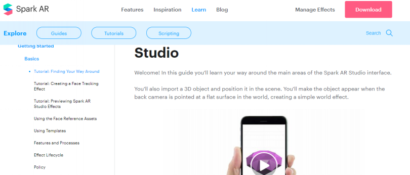 Если вам нужно больше рекомендаций, отправляйтесь в учебный центр, где вы найдете коллекцию учебных пособий. Раздел «Начало работы» содержит основы, которые помогут вам быстро освоить функции и способы навигации в Spark AR Studio. Он также включает в себя учебные пособия по созданию эффекта отслеживания лиц, предварительному просмотру эффектов Spark AR Studio, использованию ресурсов ссылок на лица, шаблонов, функций и процессов, жизненного цикла эффекта, политики и многого другого.