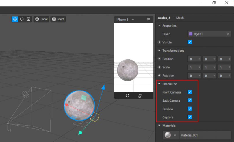 Когда ваш объект находится в окне просмотра, самое время добавить эффекты. Они будут связаны с тем, как ваш объект реагирует на движения пользователя. Эффекты включают в себя то, как ваш объект будет двигаться и как он будет выглядеть при позиционировании под разными углами в реальном мире. Для нашего объекта мы будем использовать визуализацию луны. Чтобы анимировать наш объект, мы перетащим его с панели «Ресурсы» на панель «Сцена», чуть ниже пункта меню «перетащить сюда».