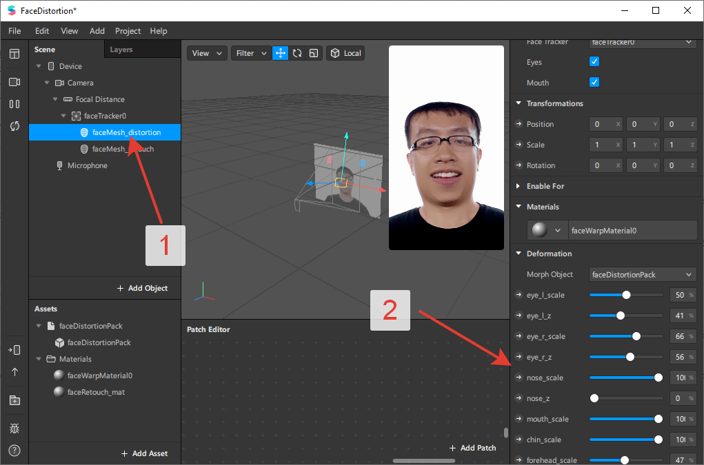 Далее закрываем окно с источником видео и кликаем на пункт faceMesh_distorion . Затем справа можно поиграться с ползунками для изменения размеров глаз, носа, подбородка, формы головы и тп.