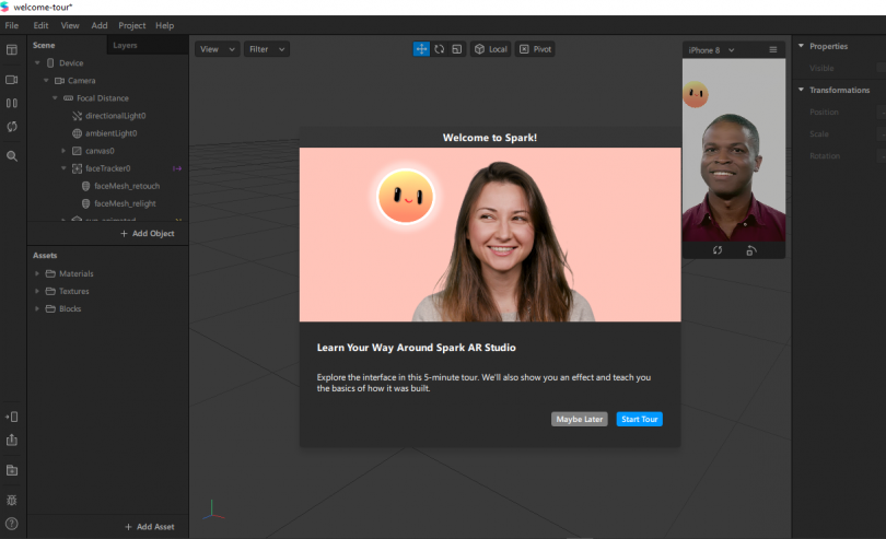 После установки мы рекомендуем вам потратить некоторое время на изучение нескольких руководств, чтобы ознакомиться с платформой. Spark AR Studio устанавливается с ознакомительным уроком. Это длится пять минут и поможет вам понять, как пользоваться большинством функций платформы.