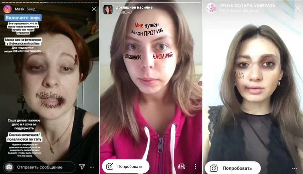 Сторонники создания закона о домашнем насилии запустили флешмоб «Янехотелаумирать» и создали специальные маски для историй в Инстаграм. Это ярчайший пример поднятия важных общественных вопросов.