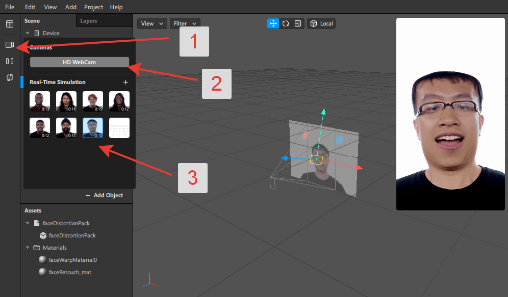 Для того, чтобы протестировать маску, включаем визуальный симулятор. Он находится в правом верхнем углу. В выпадающем списке выберите модель устройства, чтобы протестировать фильтр на нём. При желании вы можете нажать по «HP webcam», чтобы попробовать на себе.