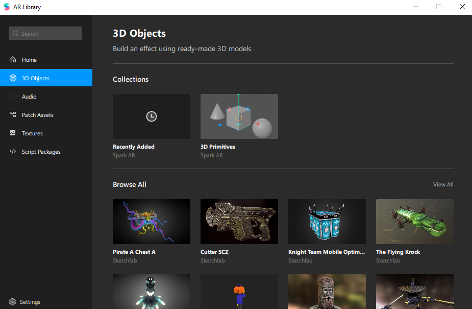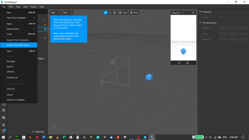 Окно просмотра может выглядеть очень сложно, но не забывайте использовать раздел учебников для получения инструкций по использованию каждой функции, если вы где-то застряли. В окне просмотра вам нужно будет добавить объект. Вы можете импортировать один из них или получить доступ к огромной библиотеке объектов Spark AR Studio. Мы собираемся использовать библиотеку AR для импорта объекта. Чтобы следовать, нажмите File в главном меню (вверху слева от приложения), затем нажмите Import from AR Library.