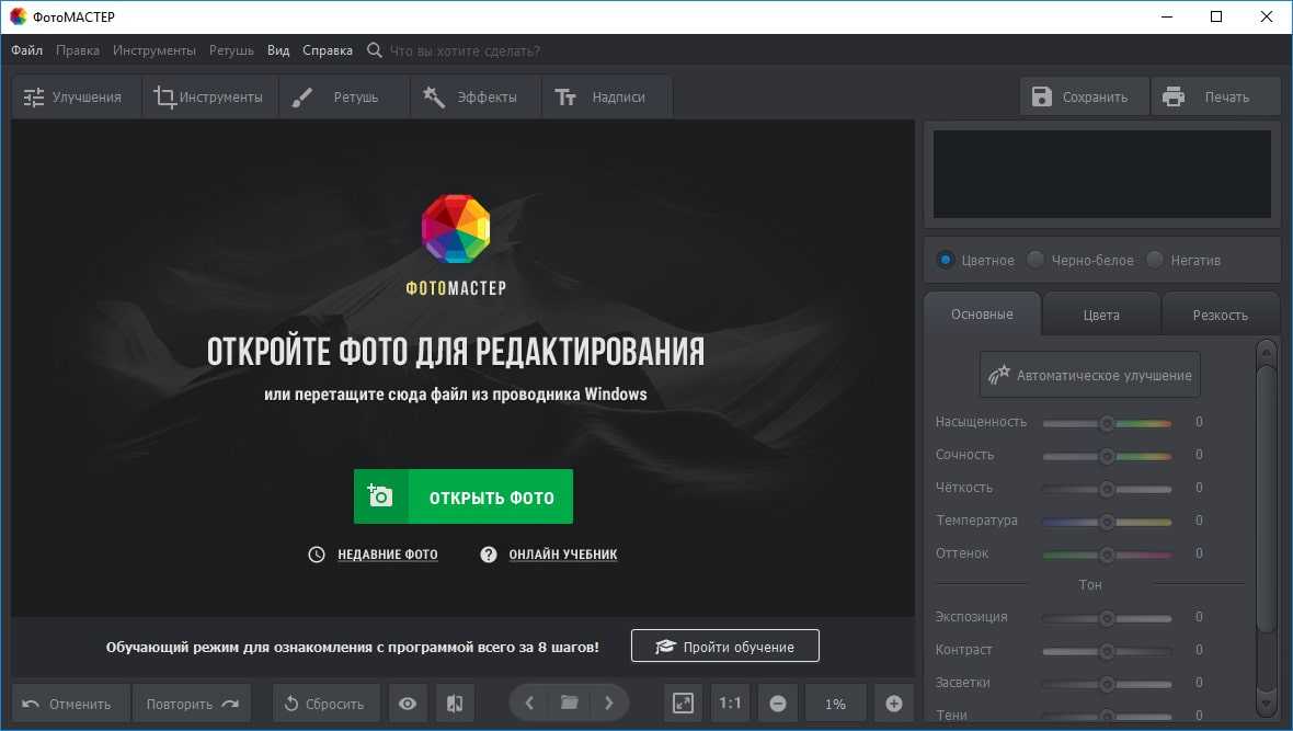 В стартовом окошке редактора нажмите «Открыть фото». Появится проводник, который даёт доступ к папкам компьютера. Двойным кликом мышки выберите желаемый снимок. Он окажется в рабочем поле программы.