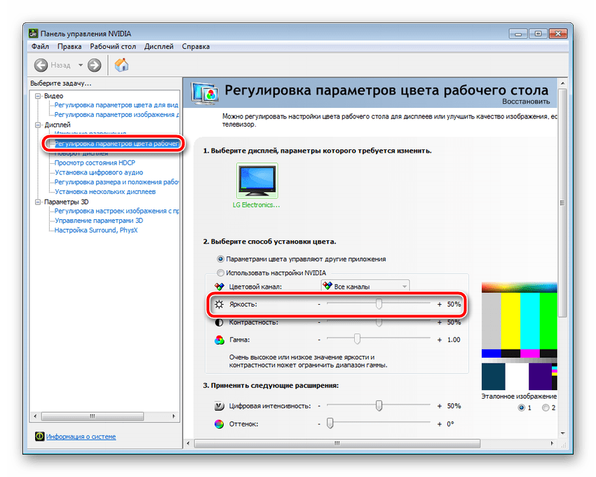 Изменяя параметры видеокарты, можно установить уровень яркости экрана. Для примера рассмотрим приложения Nvidia. В блоке «Дисплей» есть подпункт «Регулировка параметров цвета рабочего стола», в нем можно активировать приоритет настроек Nvidia над другими приложениями и установить подходящую яркость.