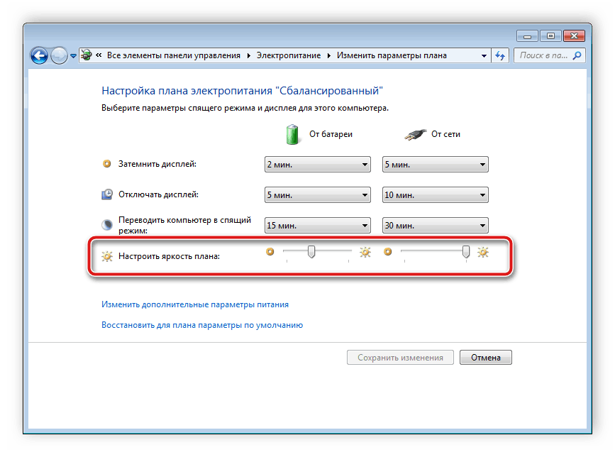 В Windows также есть настройки электропитания, которые позволяют задать яркость и установить время работы устройства в зависимости от того, подключен он к сети или к аккумуляторной батарее.