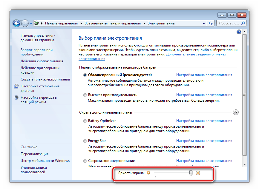 Ползунка опять нет, поэтому пользуемся программой видеодрайвера, «горячими» клавишами или меню «Электропитание».