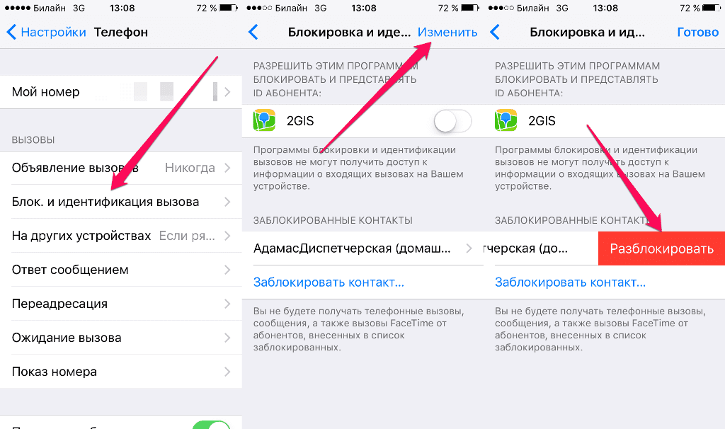 Для разблокировки номеров телефонов зайдите в настройки блокировки и идентификации вызовов по указанному пути. Смахните «реабилитированный» номер влево и рядом с ним появится кнопка «Разблокировать».