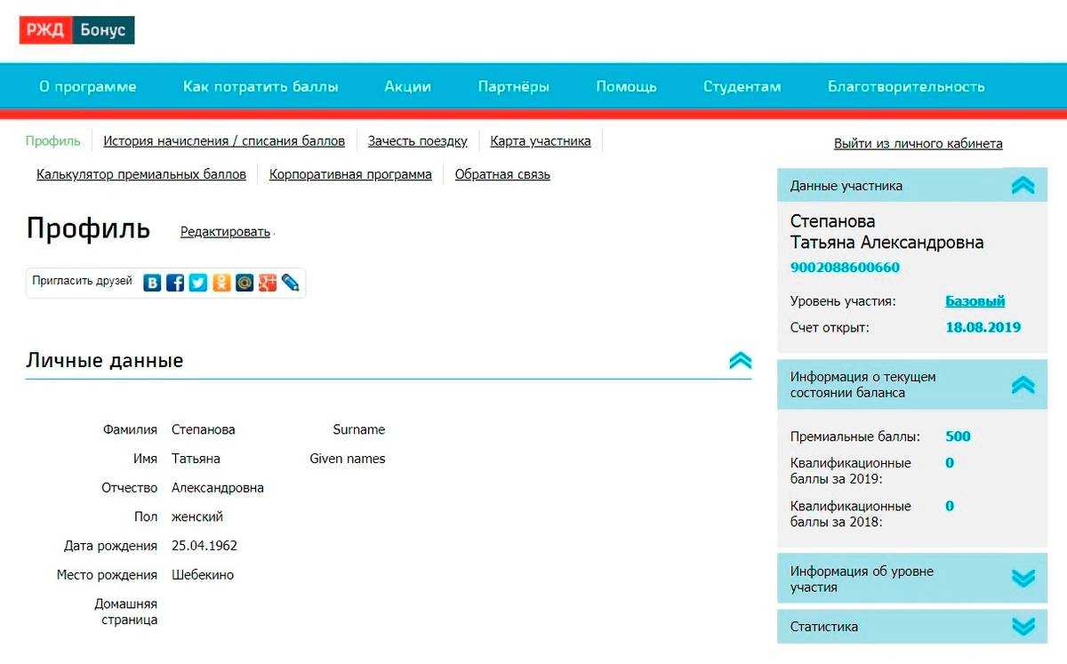 В личном кабинете изначально отражается вкладка «Мой профиль», где содержится информация об участнике программы РЖД Бонус согласно заполненной анкете. С правой стороны отражаются три раскрывающихся меню, включающие данные о накопленных и потраченных бонусах, а также уровень пользователя и дата открытия счета.