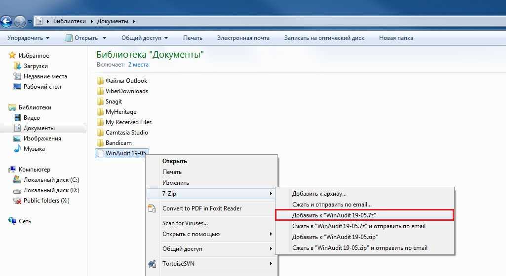 Кликаем правой кнопкой мыши по папке, из списка выбираем 7-Zip или WinRAR и создаем архив.