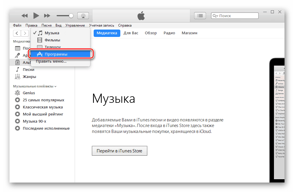 - Нажмите на «Музыка» и перейдите на вкладку «Программы».