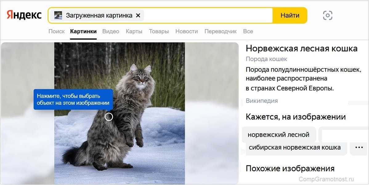 В результате поиска по своей базе, Яндекс выдает, что на картинке, оказывается, норвежская лесная кошка. В Гугле после поиска по этой же картинке сообщалось, что это сибирская лесная кошка. А у Яндекса, как мы видим, другое мнение по этому поводу, хотя оно не сильно отличается от мнения Гугла.