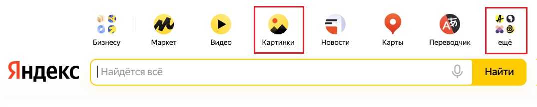 В Яндексе есть сервис Картинки. На главной странице поисковика нужно кликнуть по значку «Картинки» (рис. 5). Если этого значка нет, откройте «Еще» — там находится список всех сервисов Яндекса.