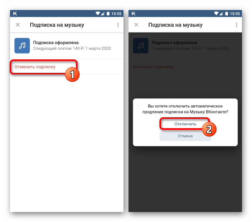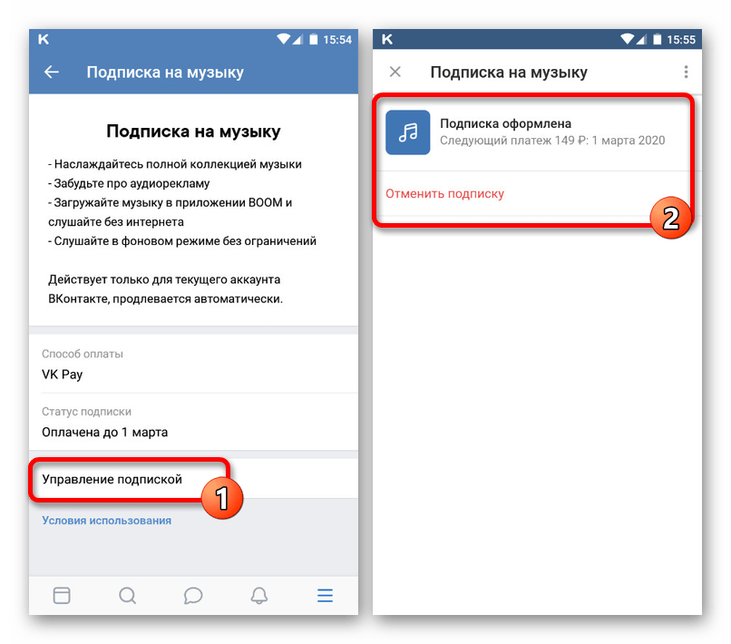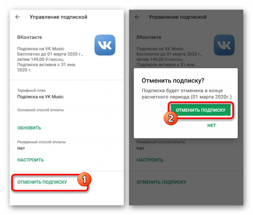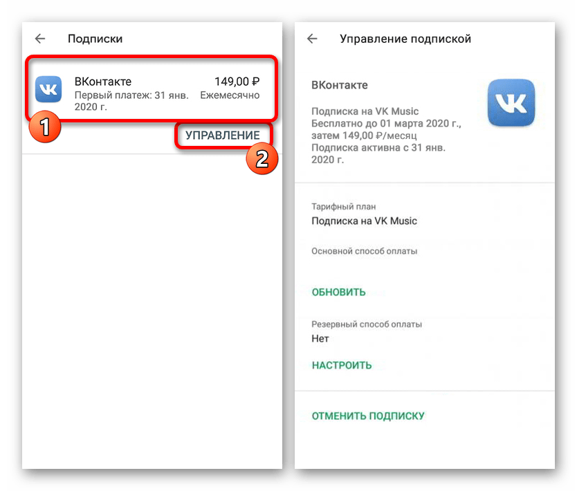 При условии оформления подписки на музыку ВКонтакте через приложение BOOM на Android-устройстве, выполнить отключение можно будет только в Google Play Маркет. Требуемые действия в данном случае практически не отличаются от деактивации любых других услуг в магазине приложений и, более того, были нами упомянуты в отдельной инструкции на сайте.