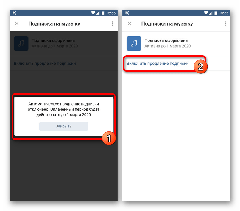 После проделанных действий остановится списание средств с VK Pay, а музыка в приложении будет предоставляться с ограничениями. Если нужно, для восстановления данной услуги используйте ссылку «Включить продление…» в том же разделе.