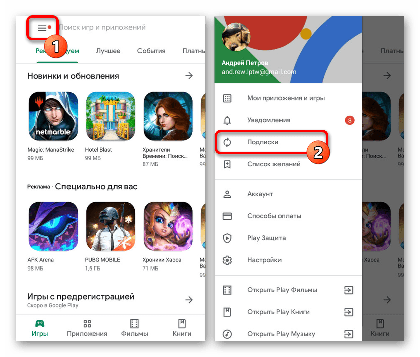 Нужно открыть Google Play Маркет, затем в левой верхней части экрана нажать на три полоски. В открывшемся меню кликнуть на раздел «Подписки».