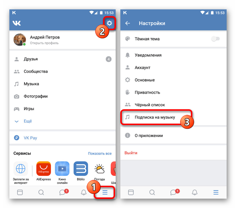 Открыть приложение ВКонтакте, после этого вывести на экран особое меню. Дальше будет нужно кликнуть на шестеренки в правом верхнем углу. Потом в настройках можно будет узреть пункт «Подписка на музыку».