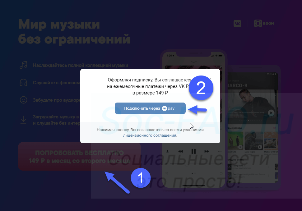 На следующем шаге мы должны нажать на кнопку » Попробовать бесплатно «. Появиться окно, где нас проинформируют о том, что мы соглашаемся на ежемесячные платежи, через сервис VKpay. Если вы согласны с этим, жмем » Подключить через VK pay «.