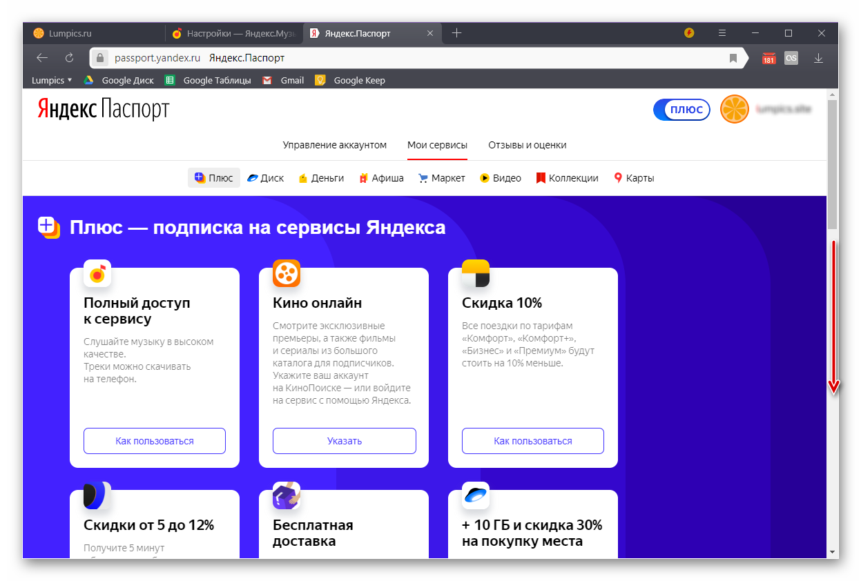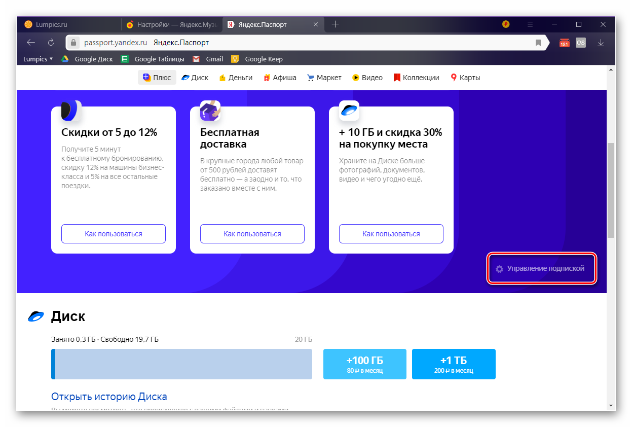 - Зайти в «Яндекс Паспорт». В разделе «Плюс» в нижнем правом углу будет видна подписка на сервисы Yandex. С помощью ссылки «Управление подписки» перейти в нужный раздел.