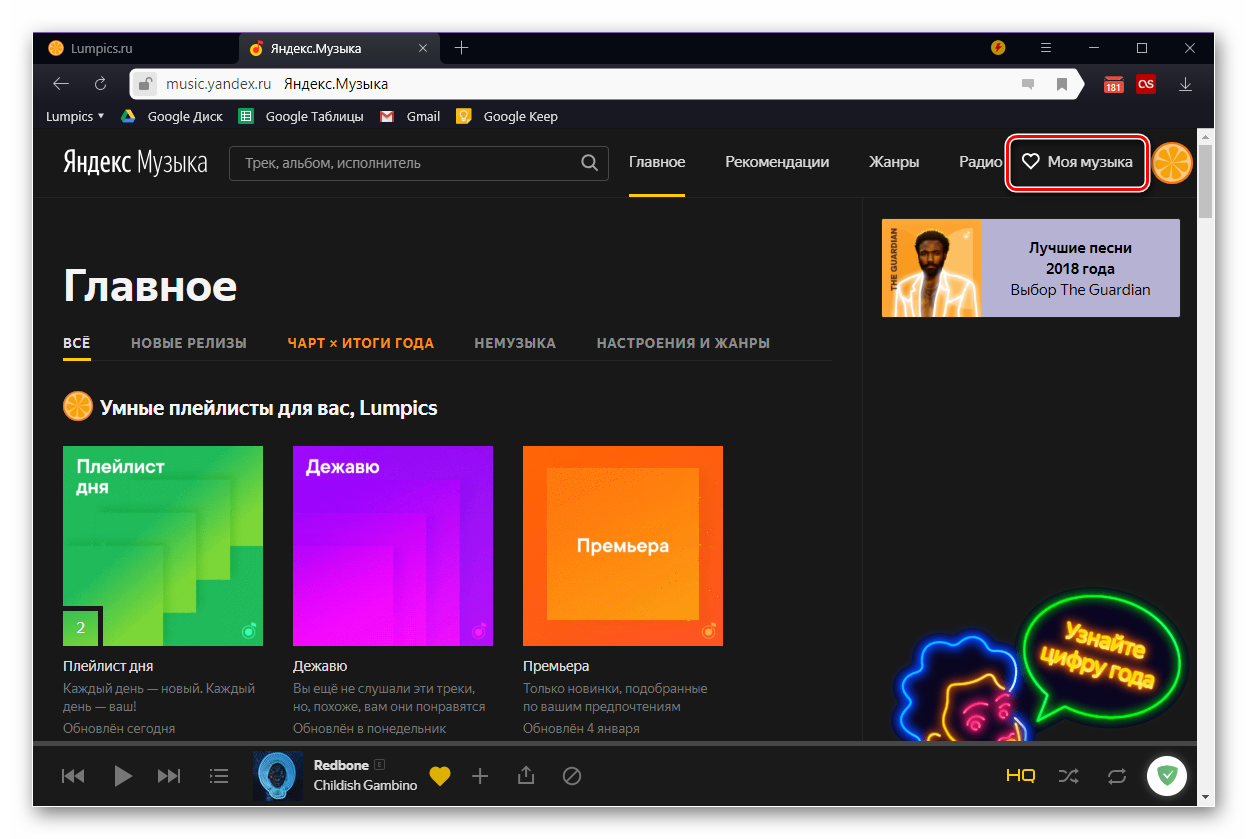 - Открыть страницу сервиса. Справа в верхнем углу кликнуть по закладке «Моя музыка», кликнуть по ней.