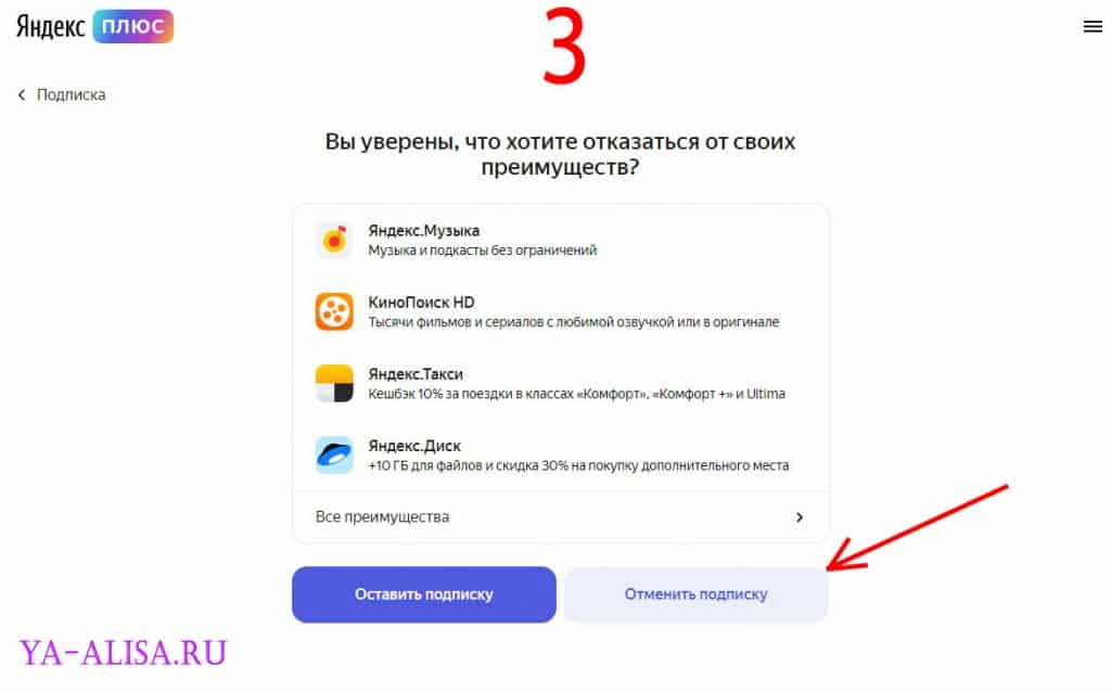 - Пролистайте экран вниз и выберите «Отменить подписку». Затем ещё раз выберите «Отменить подписку». Потом выберите «Отменить подписку» ещё раз. На последнее предложение Яндекса ответьте «Нет, отмените подписку».