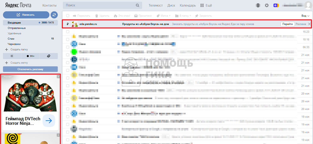В почте Яндекс есть два основных места, где размещается реклама в версии для компьютеров: