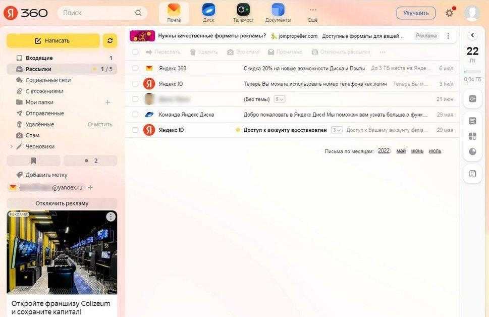 Реклама в Яндекс Почте располагается в двух местах личного кабинета пользователя. Она может располагаться: