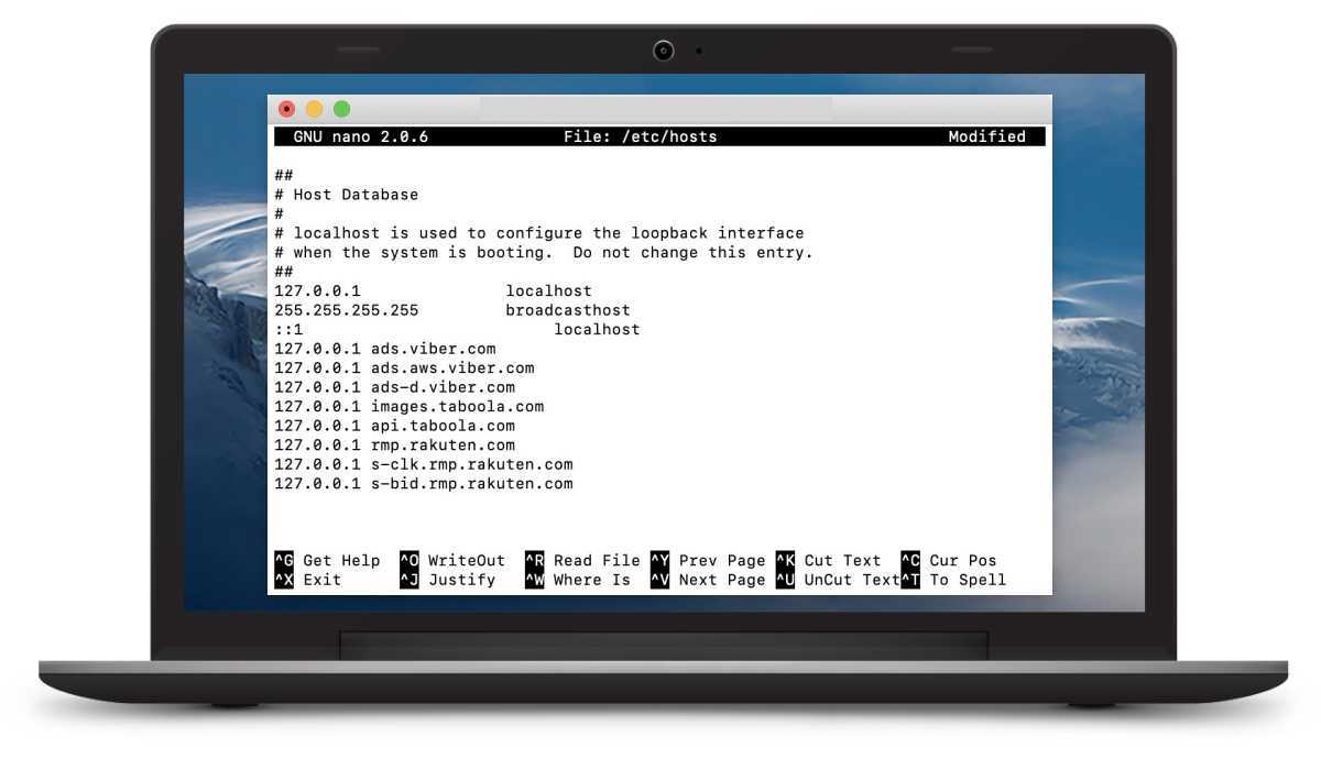 Шаг 3. Прямо в терминале у вас откроется файл hosts для редактирования. С новой строки под 1 local hosts добавьте сайты для блокировки: