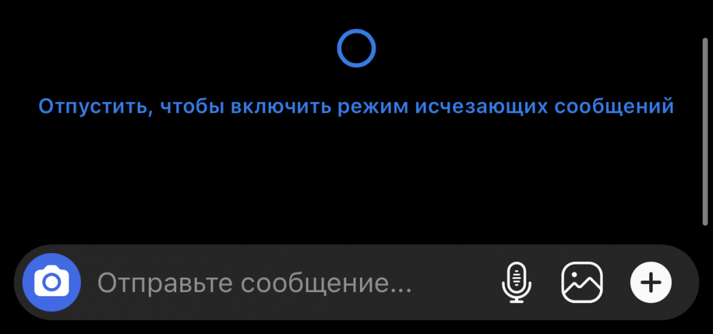 Чтобы отключить режим исчезающих сообщений, сделайте свайп снизу вверх и задержите палец на экране. Отпустите его, когда кольцо прогресса из серого станет синим.