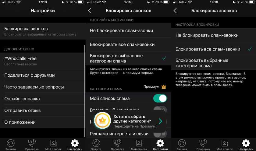 На iOS и Android стоит также зайти в настройки самого приложения и выставить нужные параметры. Так, в бесплатной версии Kaspersky Who Calls вы не можете выбрать, какие категории спама заблокировать. Однако доступна блокировка сразу всех категорий.