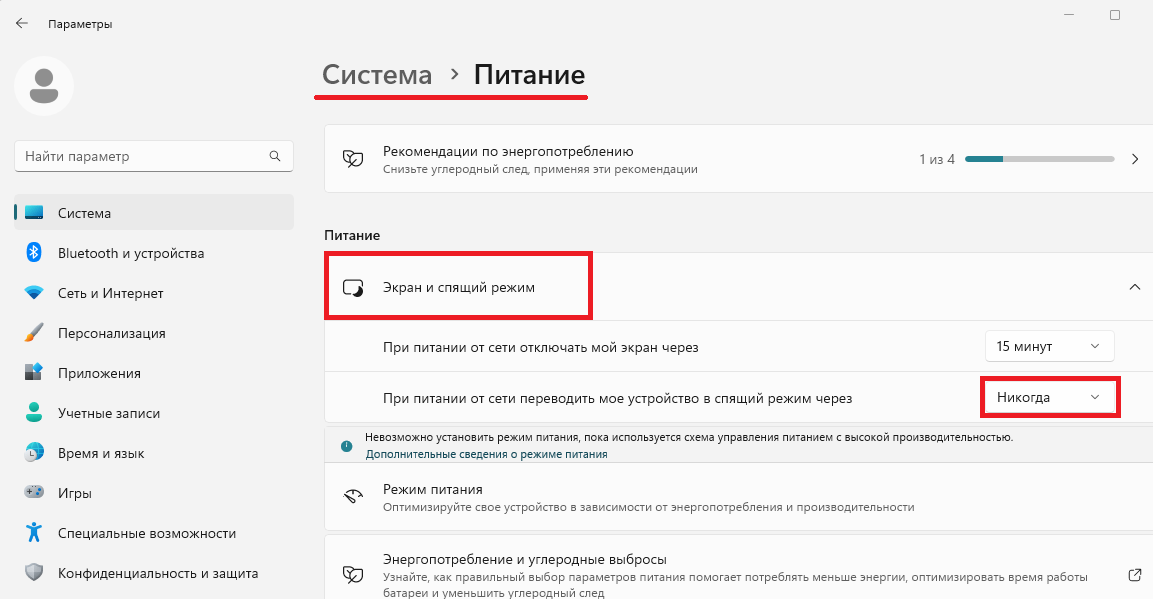 - Перейдите в раздел Пуск > Параметры >Система > Питание и спящий режим.