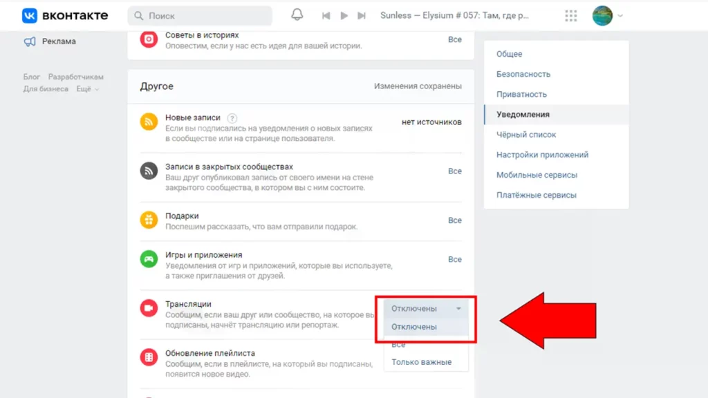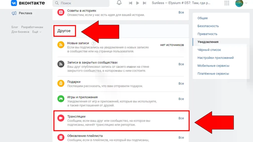 В подразделе «Другое» также много важных моментов. Например, отключение уведомлений о новых записях, подарках, действиях в приложениях (особенно в играх), трансляциях, подкастах, достижениях, закладках.