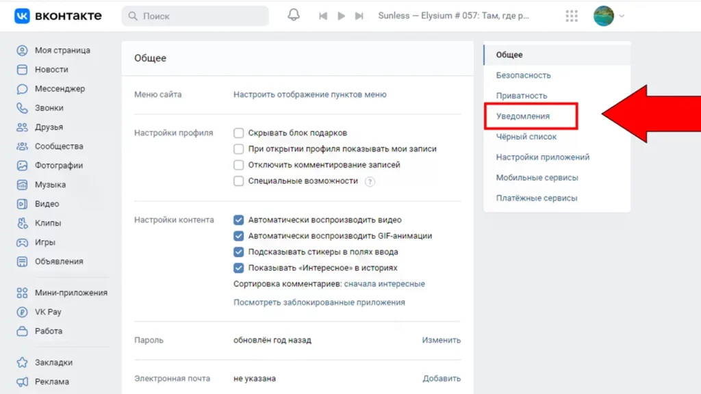 - Перейдите в раздел «Уведомления» в боковом меню справа.