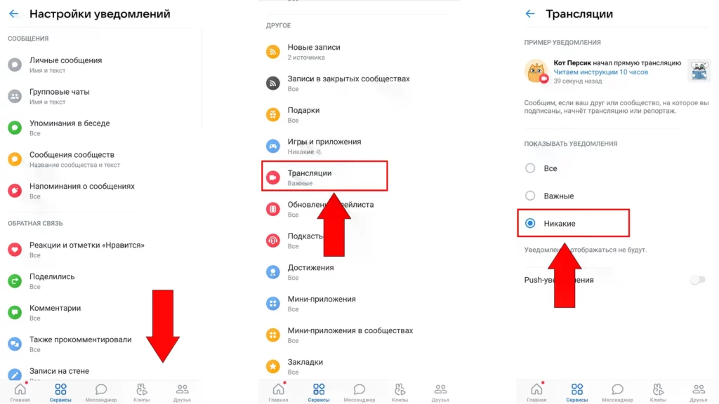 Уведомления о репортажах от сообществ и о прямых трансляциях друзей будут выключены.