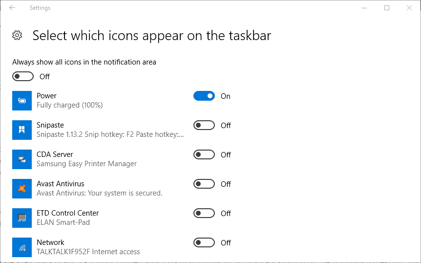 - Вам также может понадобиться настроить параметры области уведомлений. Введите «Выберите, какие значки появляются на панели задач» в поле поиска Cortana, чтобы открыть окно, расположенное ниже.