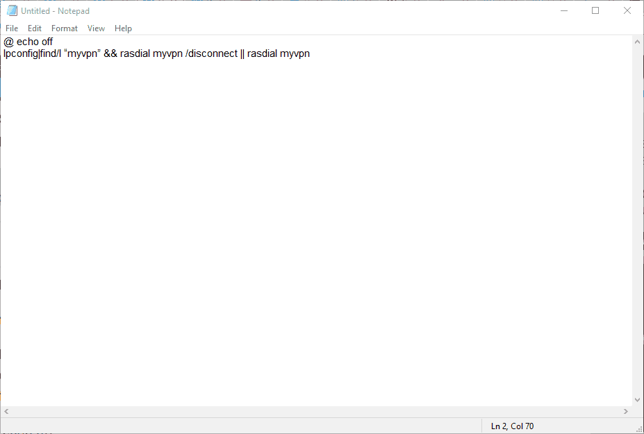 @ эхо выключено Ipconfig | найти / I «myvpn» && rasdial myvpn / отключить || rasdial myvpn