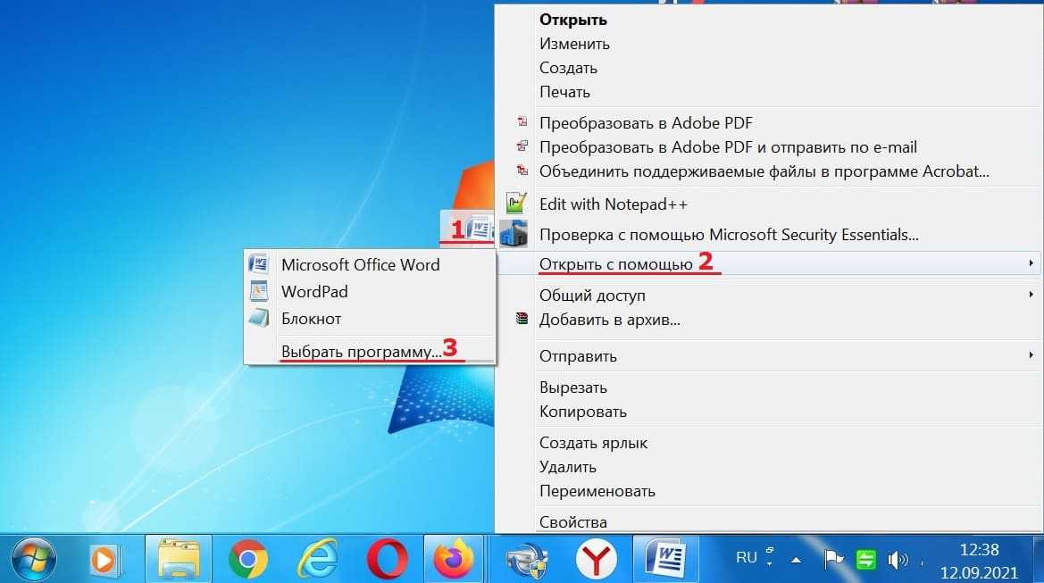 Появится меню, в котором левой кнопкой мыши щелкаем «Открыть с помощью» (2 на рис. 1). Перед глазами предстанет список программ, с помощью которых можно открыть файл docx.