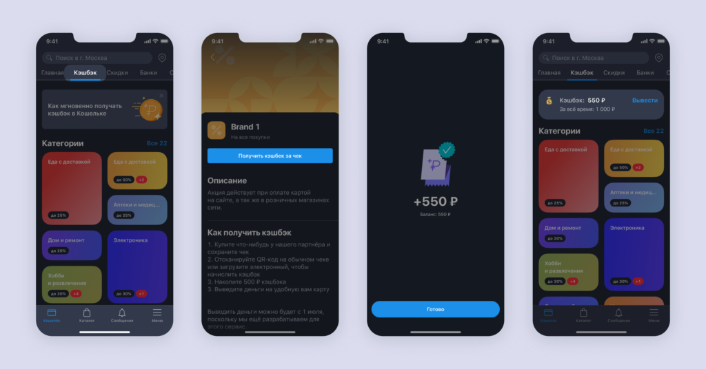 Кроме скидок, акций и выгодных предложений в Кошельке можно возвращать часть денег за покупки — даже за те, которые оплатили наличными. В приложении есть категории кэшбэка на все случаи жизни: продукты, одежда, дом и ремонт, электроника, еда с доставкой и другие.