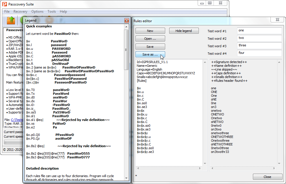 Например, если известно, что пароль – набор определённых слов с неизвестной последовательностью и неизвестным регистром букв (может большие, может маленькие, может в начале, может нет), а ещё и часть символов заменены другими («о» на «0», «e» на «3», «a» на «@» и т.п.). Ничего сложного: составляем (или подбираем) нужный словарь(и), пишем набор правил по объединению и мутации словарей, запускаем поиск и чик! – взламываем забытый Zip/RAR пароль.