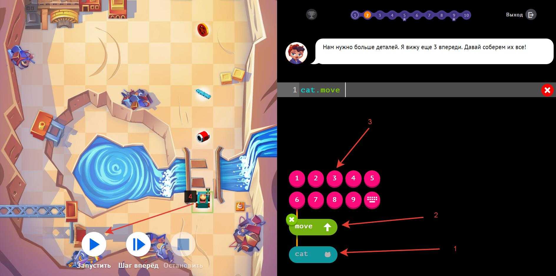 На первом уровне предстоит познакомиться с элементами управления и понять суть игрового процесса. На перовом уровне нам предстоит просто подвинуть робота на две клетки вперед и добыть нужную деталь. Для прохождения первого уровня делаем следующие действия.