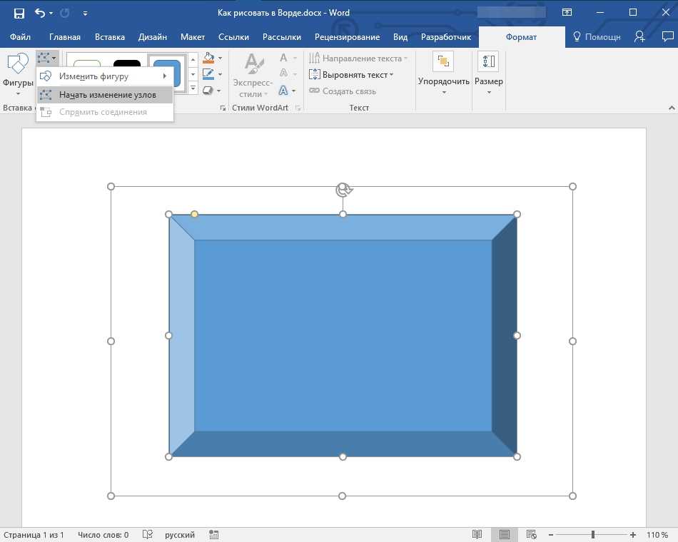 «Изменить фигуру». Настройка становится активной только при наличии какого-либо объекта на листе, это нужно учитывать. Выберите его, а затем кликните по элементу в блоке «Вставка». Вам предложат несколько действий. «Изменить фигуру» в прямом смысле слова поможет преобразовать то, что вы уже нанесли на полотно. При выборе опции «Начать изменение узлов» предлагают отредактировать точки объекта (в случае с прямоугольником в примере речь идёт о внешних и внутренних углах).