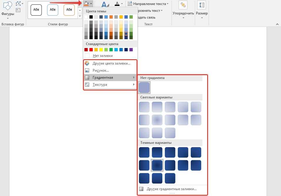 Инструменты, которые находятся в этой группе, предназначены для того, чтобы менять внешний вид вашего элемента. Как это сделать? Кликните по «Заливка фигуры» или же «Контур фигуры» для того, чтобы перед вами открылся блок с палитрой цветов. Выбирайте то, что понравится больше всего. Кроме того, вам предлагают множество инструментов, которые способны улучшить внешний вид объекта и сделать его необычным. Один из таких вариантов – применение эффекта градиента.