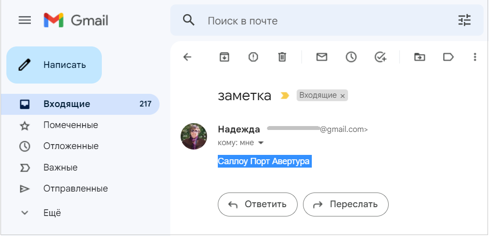 После отправки заметки по электронной почте на смартфоне, следует открыть почту на компьютере (рис. 7).