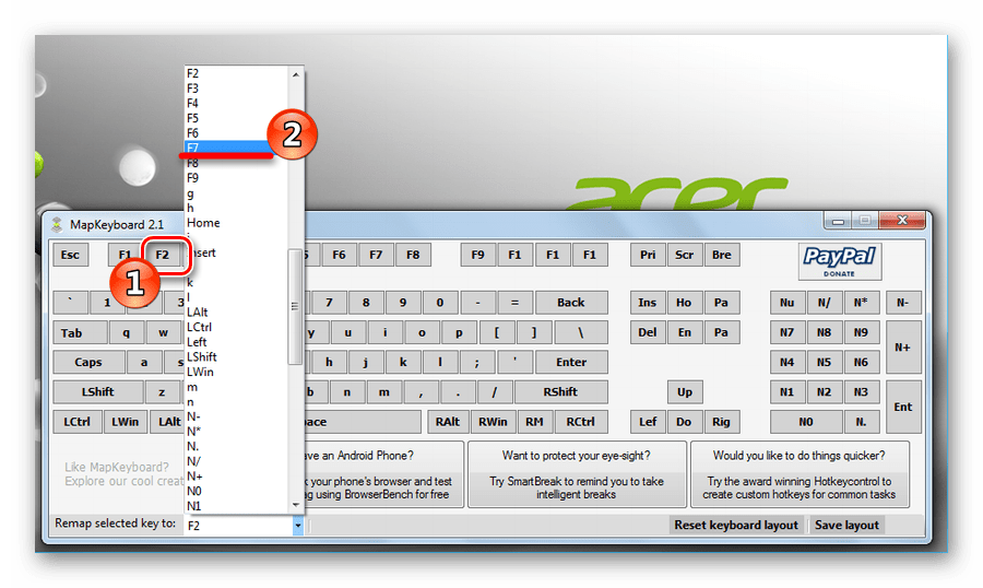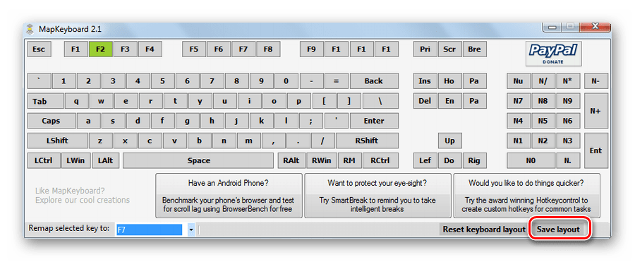 - MapKeyboard – после распаковки архива нужно запустить от имени администратора и затем на виртуальной клавиатуре выбрать клавиши, которые нужно переопределить. Можно вернуть настройки по умолчанию нажатием одной кнопки.