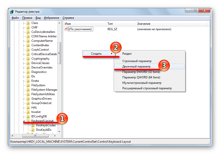 В левой колонке найдите позицию , после чего в пустой области справа нажмите правой кнопкой мыши и выберите пункт «Создать» > «Двоичный параметр», указав в качестве имени «Scancode Map».