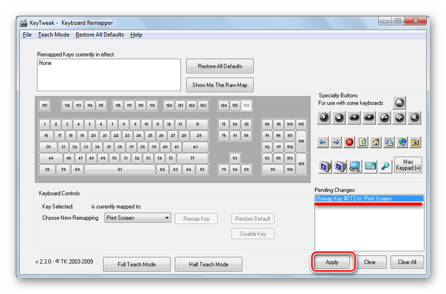 Нажмите кнопку «Full Teach Mode», затем — «Begin Teach Mode», после чего нажмите клавишу на клавиатуре, которую необходимо переназначить, а затем клавишу, которая будет использоваться вместо нее. Завершите настройку нажатием кнопки «Remap Key#1 to Key#2».