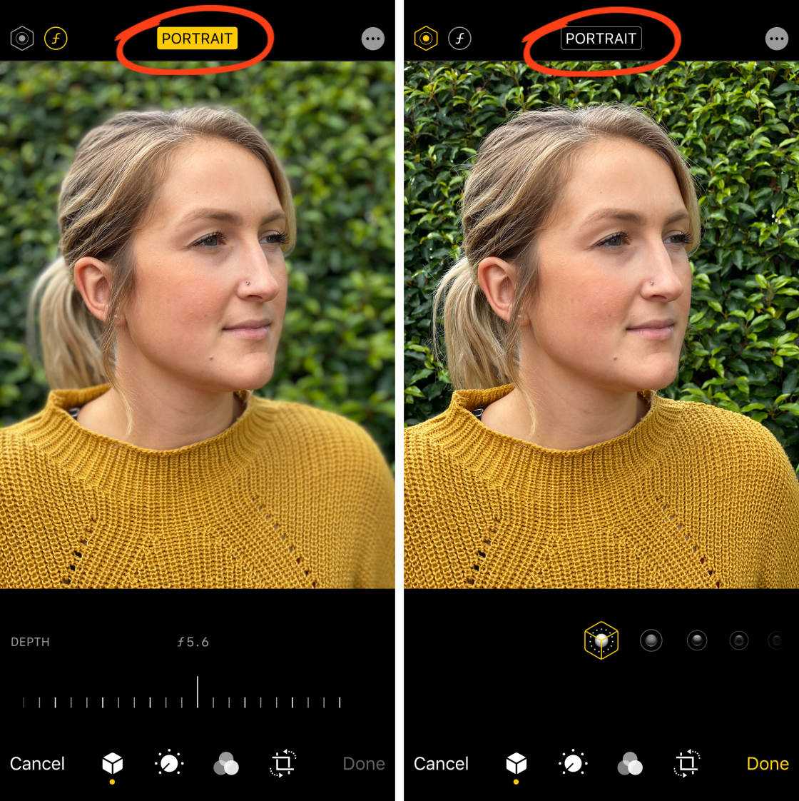 Чтобы убрать размытие, нажмите желтую опцию Портрет в верхней части экрана редактирования. Вы можете включить ее в любой момент, снова коснувшись Портрета.